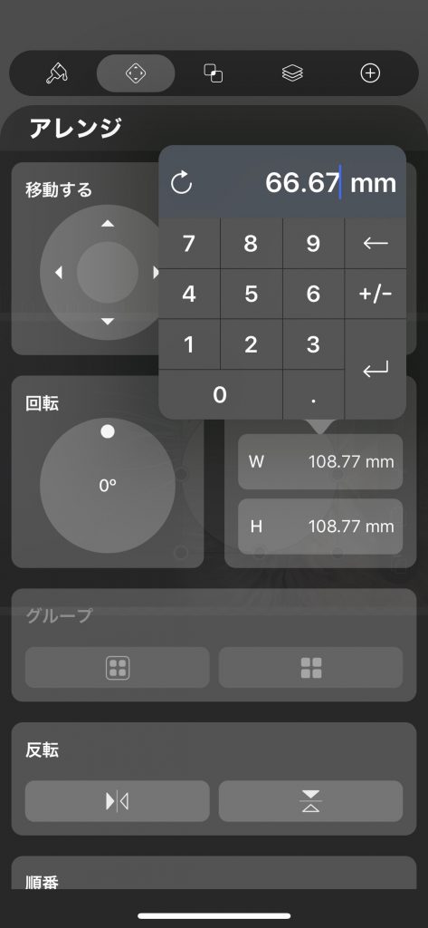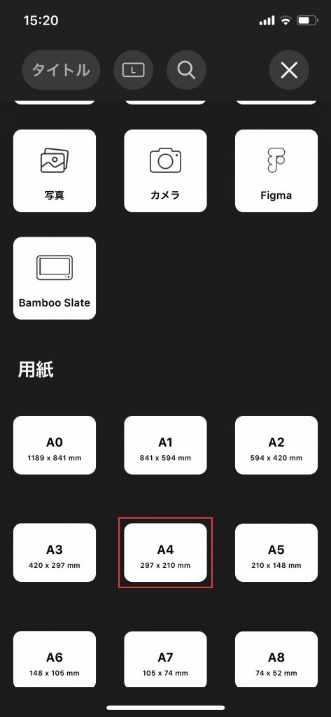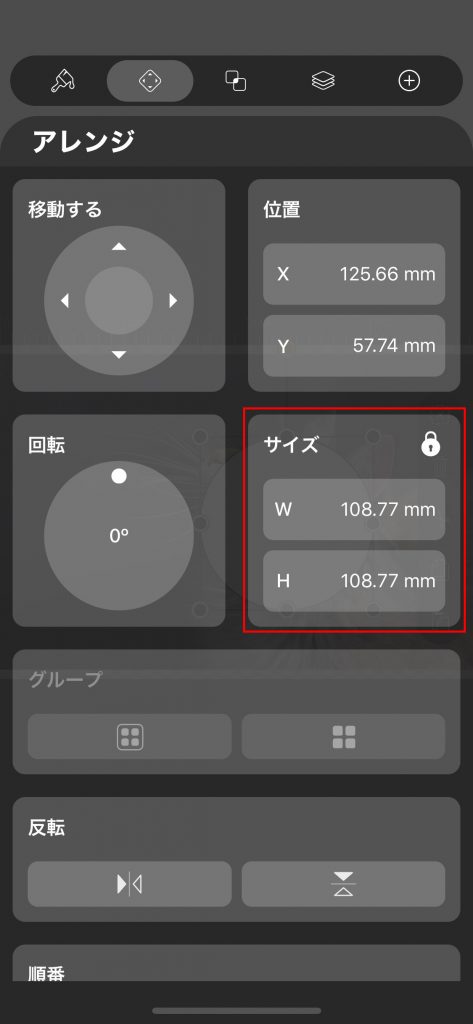 上部メニューの左から2番目のタブをタップし、サイズの表示されている部分をタップして変更します。