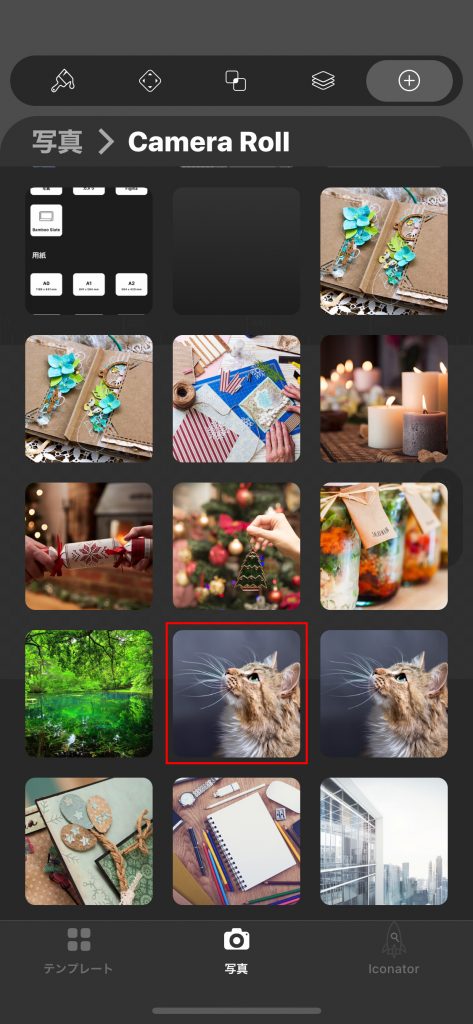 カメラロールから挿入したい写真を選んで一度だけタップし、上から下へスワイプしてメニューを閉じ、元の画面へ戻ります。