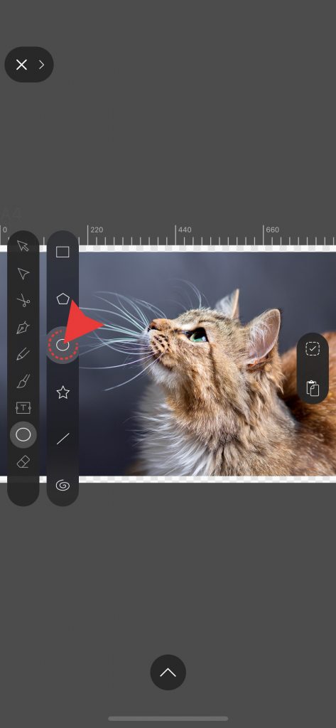 写真の上に真円を描けたら、下部の矢印をタップしてメニューを開きます。