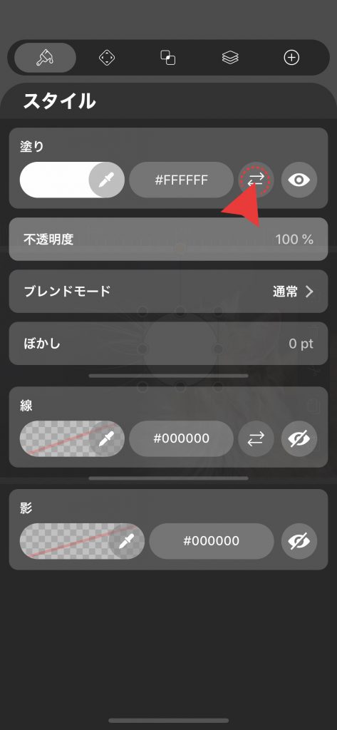 そのままでは円が白塗りになっていて写真の切り抜き位置を確認し難いため、メニューの一番左をタップしさらに『塗り』の中にある『左右を向いた矢印』をタップします。