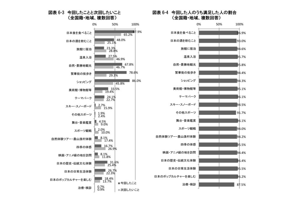 外国人観光客の消費行動も多様化しています。同調査からは、日本食を楽しむ、ショッピング、自然や景勝地の観光など、従来型の活動は根強い人気を誇る一方で、文化的・趣味的な体験への関心も高まりを見せていることがわかります。