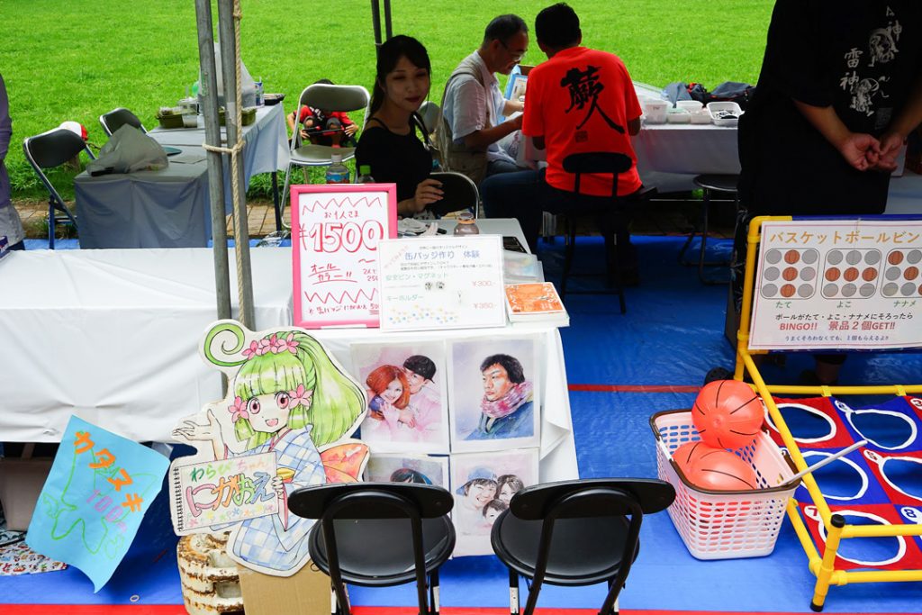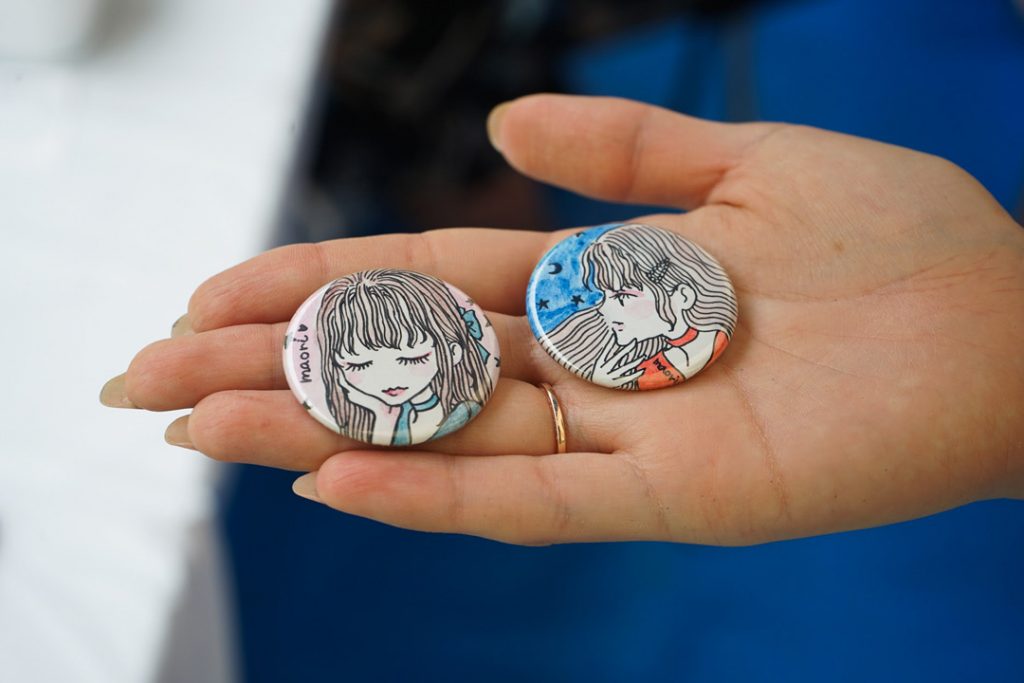 現在、缶バッジとコラボを行なっている似顔絵体験もその取り組みのうちの一つで、ブースに来てくれた人が喜んでくれるように、イラストレーター兼漫画家である長澤真緒理さんに本格的な似顔絵をお願いしているのだと言います。