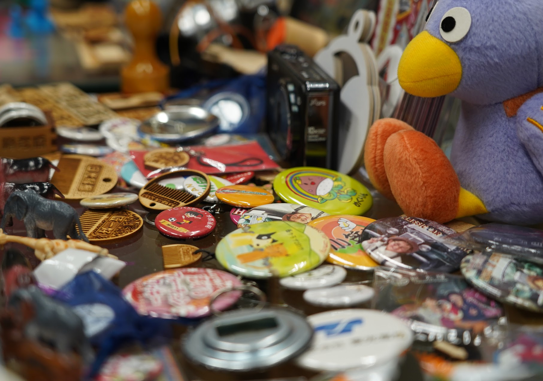 オフィスの机には、缶バッジをはじめとした事業に関連するグッズが所狭しと並べられている
