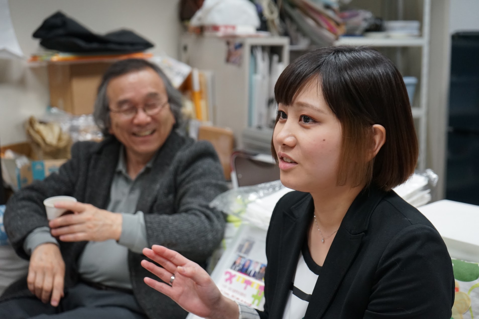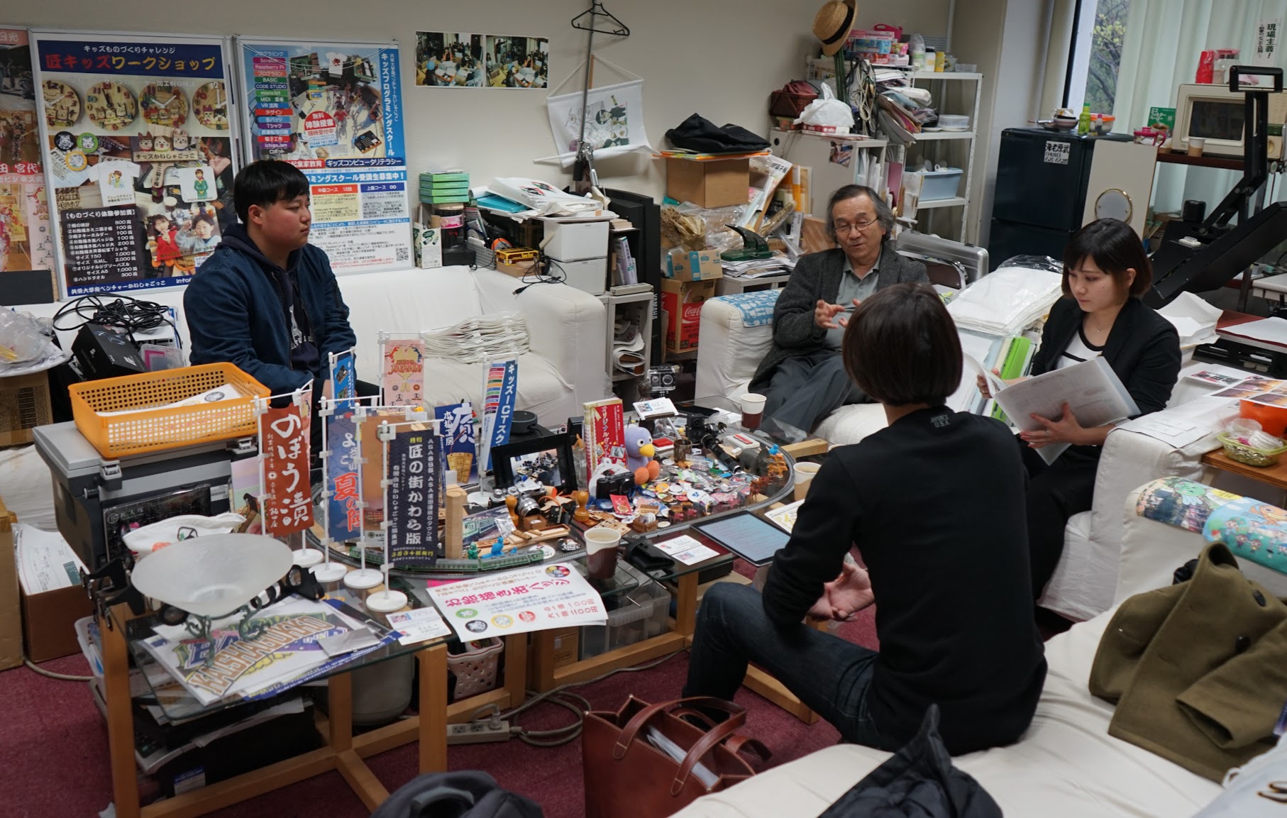 有限会社かいしゃごっこ代表の海老原さん、かいしゃごっこ社員の学生、そして卒業生がオフィスに集まり談笑している様子