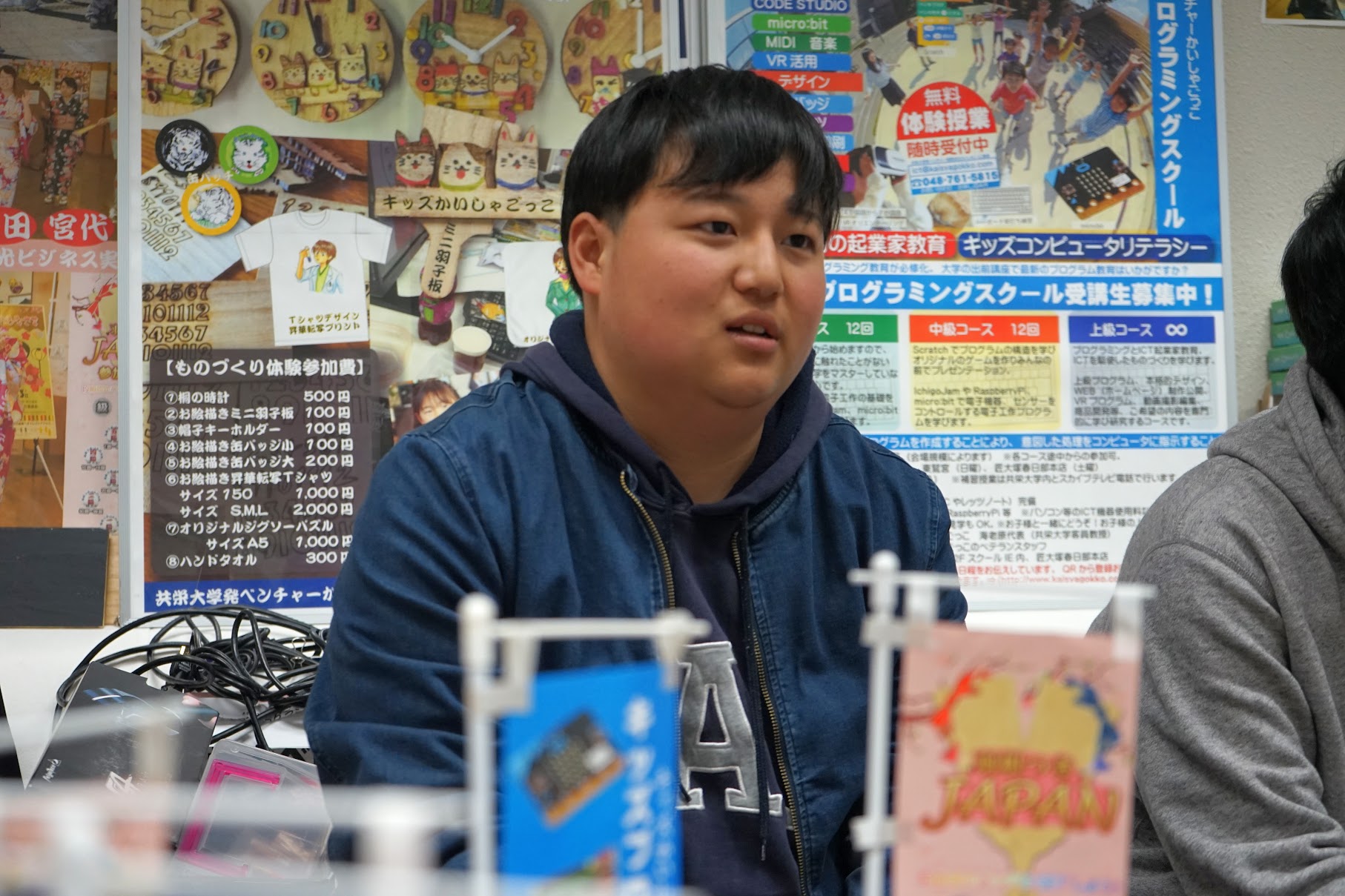 「私は両親が教員なので、自分も自然と両親と同じ道を進むものだと感じていました。ところが、かいしゃごっこで活動する中で、プログラミングなどの最新テクノロジーや、缶バッジを作ったものづくりなど、視野が広がりました。今後はここで学んだことを教育に応用して、新しい教育のあり方を模索していきたいと思っています」