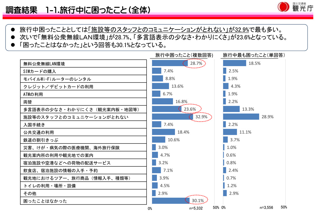 『旅行中に困ったこと(全体)』に関して『施設等のスタッフとのコミュニケーションがとれない』が最も多くの回答していおり、次いで『無料公衆無線LAN環境』と『多言語表示の少なさ・わかりにくさ』になっています。これには普段は気付き難いですが、訪日外国人目線になってみれば気付かされる事で誰もが理解できると思います。