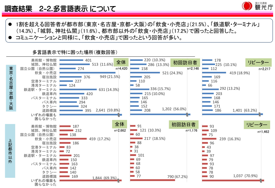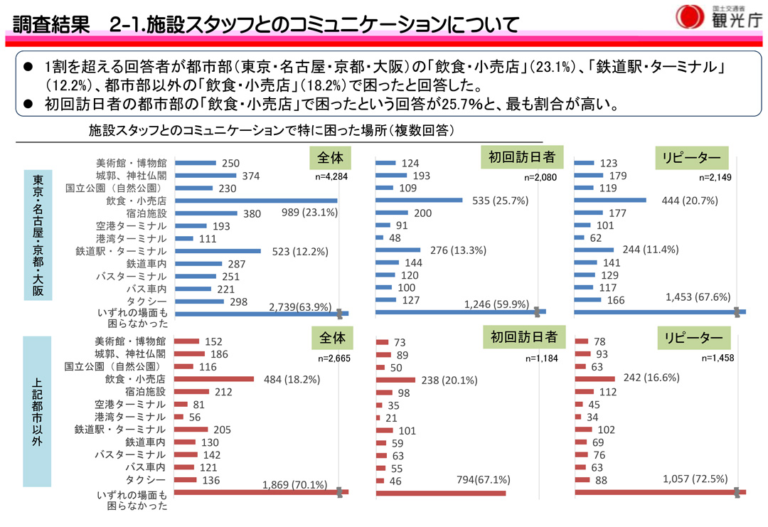 そして『施設スタッフとのコミュニケーションで特に困った場所』がどこなのか見てみると『飲食・小売店』がダントツです。これでは訪日外国人は本当に欲しいと思っている商品・サービスが提供されるのか不安になってしまいますね。はたしてこれでインバウンド消費を効果的に取り込めているのでしょうか。さらに回答の次に目立つのが交通網の要所である『鉄道駅・ターミナル 』でした。