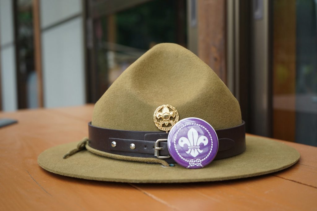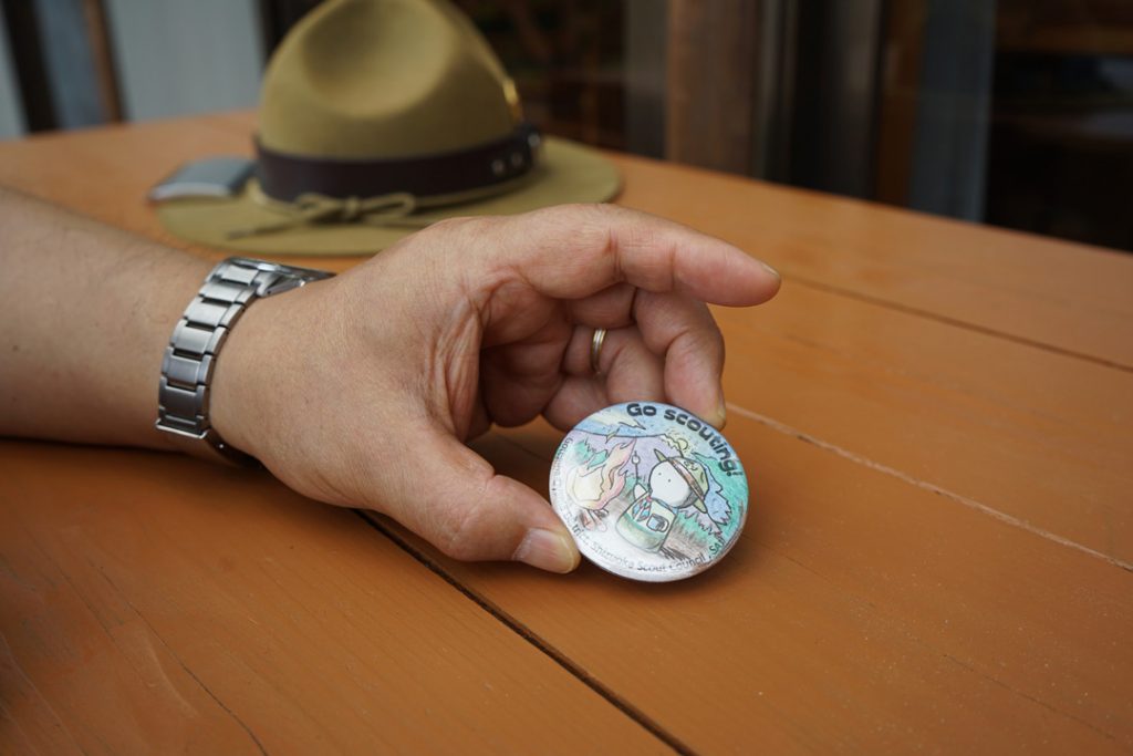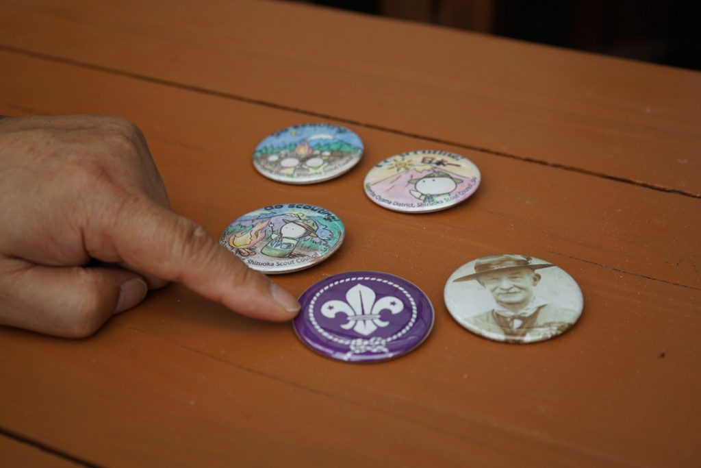濵田さんが指をさすのは、ボーイスカウトのシンボルである、ユリの花びらの缶バッジ。