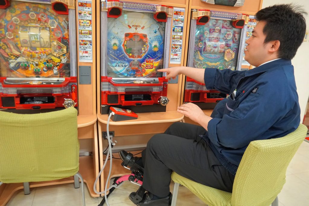 「しかし、パチンコなら男性の方でも楽しんでいただけるのではと考え、足漕ぎをしながらでないとプレイできないパチンコ台などを開発し、提供させていただいております」