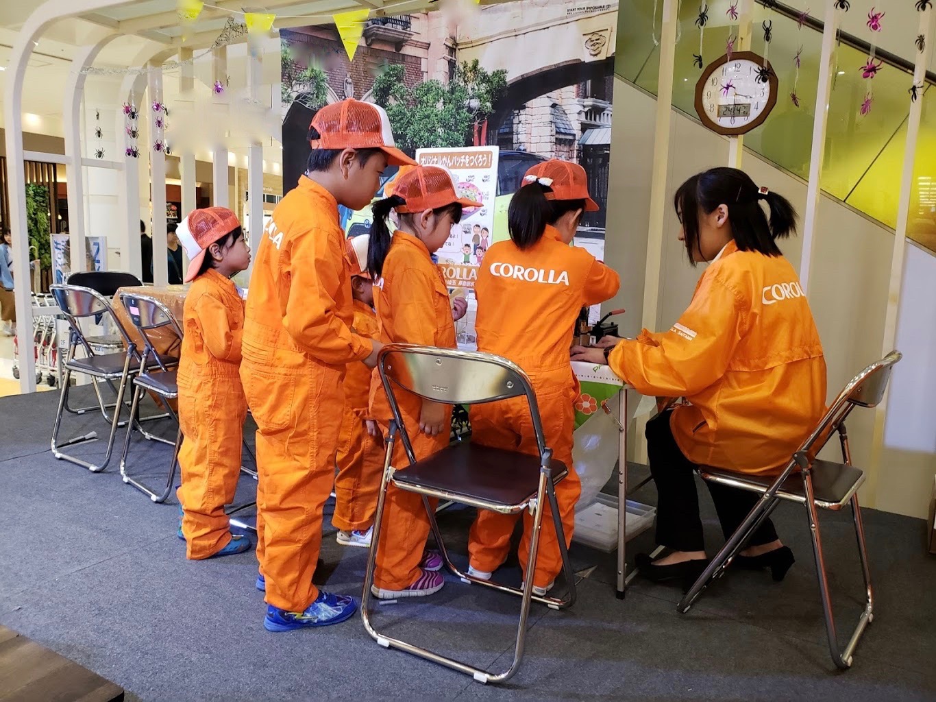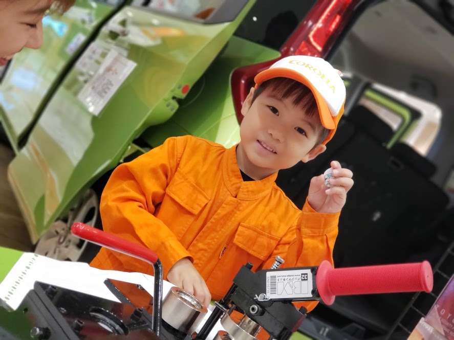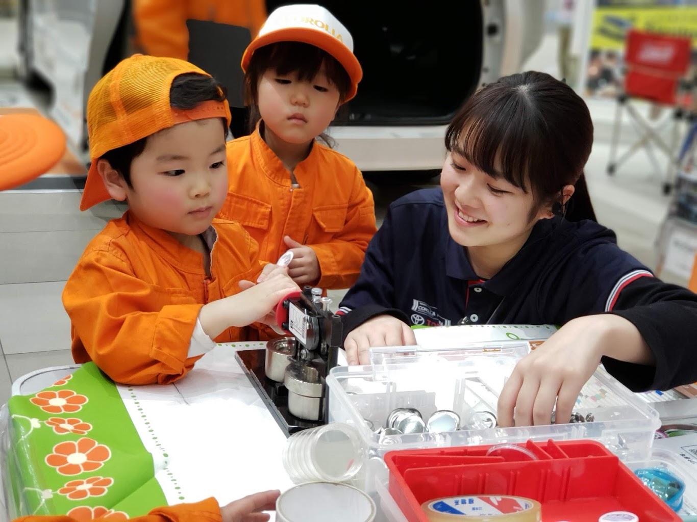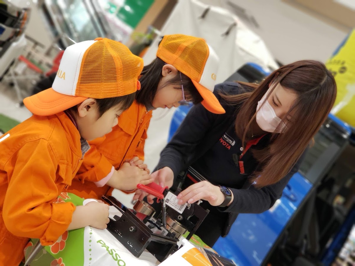 オリジナル缶バッジ体験。ツナギに着替えたお子さんは、自分で絵を描き、自分で缶バッジを作る。(写真提供:トヨタカローラ埼玉)