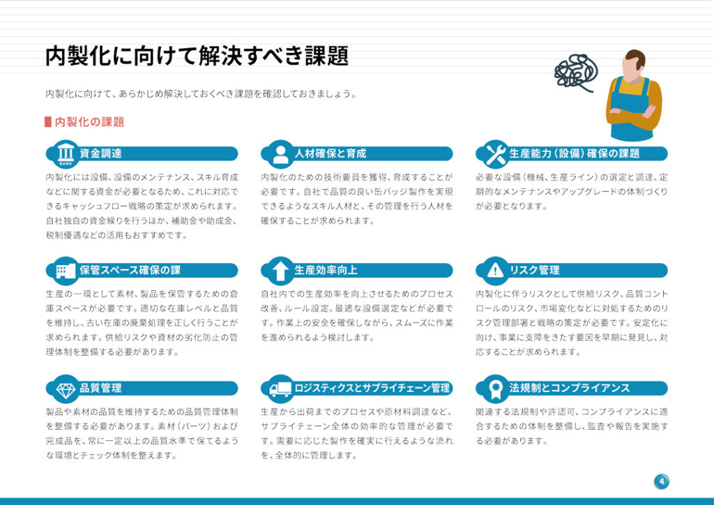 本Ebookでは、缶バッジ製作における内製化のメリットと知っておきたいデメリット、内製化すべきかどうかの判断、内製化をどのように進めていくのかの参考となるステップガイドをまとめて解説します。