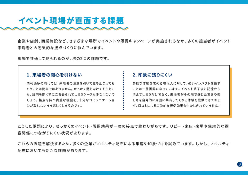 多くの情報があふれる現代では、従来の「配られるだけのノベルティ」では来場者の印象に残りにくくなっています。