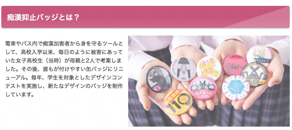こちらは痴漢被害を防ぐことを目的に、毎年公募で「痴漢抑止バッジデザインコンテスト」を開催し、受賞作品をインターネットショップで一般に向けて販売している取り組みです。