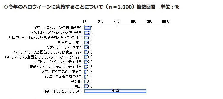 ではハロウィーンに何をするのかと言うと、「特に何もする予定はない」が76.5%のダントツ。…普段通りに過ごすのですね。