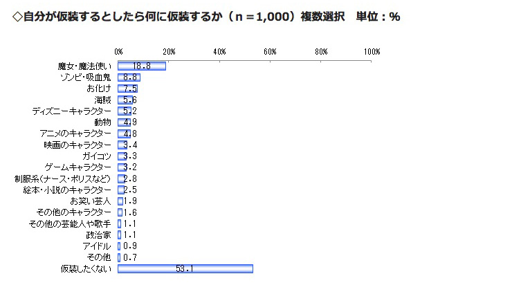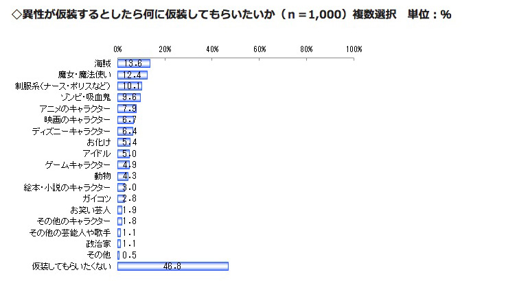 自分がもし仮装するとしたら何に仮装するかは「仮装したくない」(53.1%)が半数以上。また、異性に仮装してもらいたい衣装については同じく「仮装してもらいたくない」(46.8%)が最も高いのです。