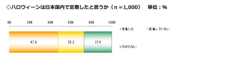 楽天リサーチによると、ハロウィーンが日本国内で定着したかという問いに47.8%の人が「定着した」と回答し、「定着していない」(25.2%)を上回っています。まだまだ発展途上感はありますが、半数近くは定着と判断しているのですね。