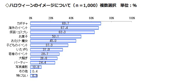 そして、ハロウィーンのイメージについては「仮装・コスプレ」が63.3%もあります。やっぱりハロウィーンと言えば仮装なんですね!!