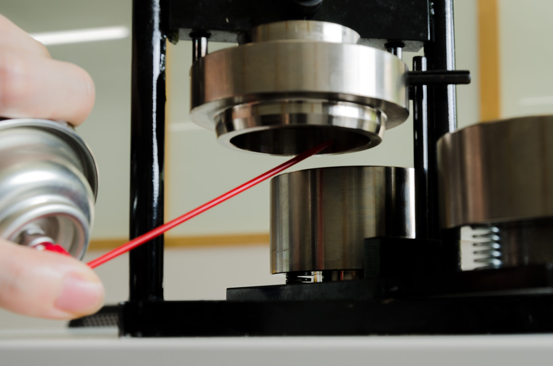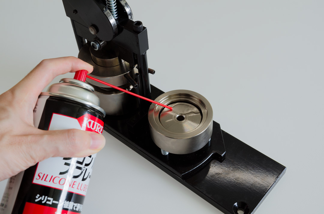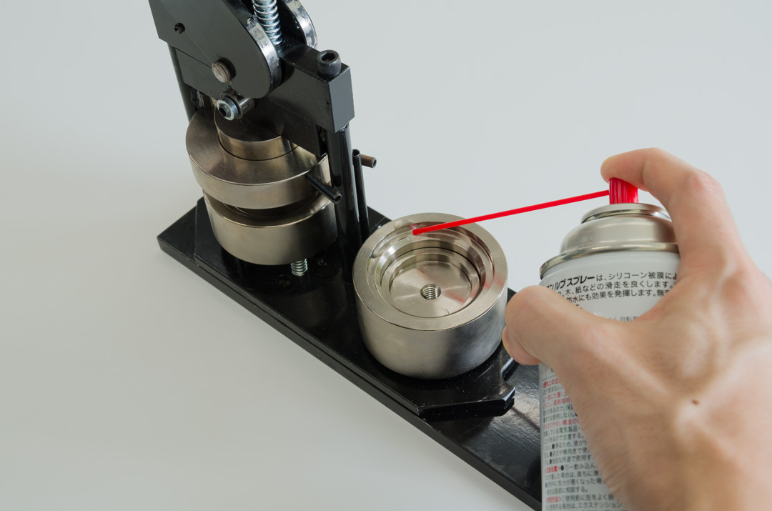 同様にアッパーダイ(上の金型)にも行いますが、基本的に缶バッジマシンを逆さにする行為は厳禁(故障の原因となる場合がある)ですので、金型を下から覗き込むようにしてスプレーを行ってください。
