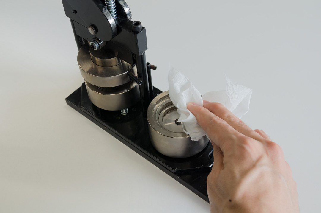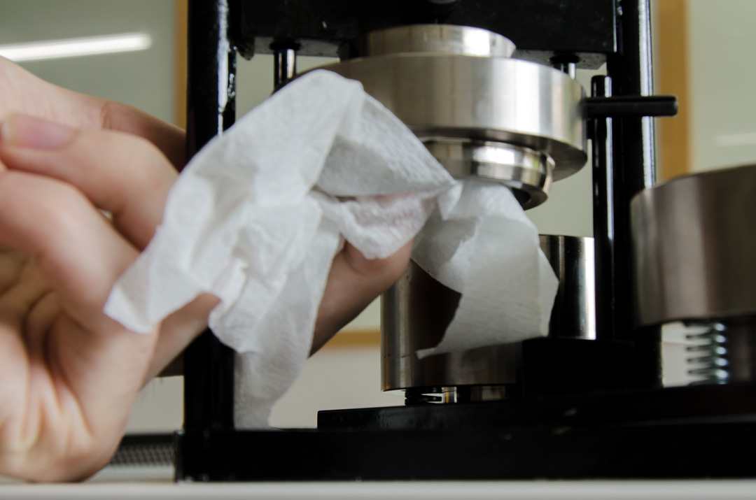 次に、清潔な布または紙ウエスなどを使用して拭き取りながら金型内部の隅々までシリコンオイルを広げてください。そうすることによって金型内部の清掃を行うとともに、プレス時のパーツの滑りを良くし、皮膜による防錆効果も期待できます。